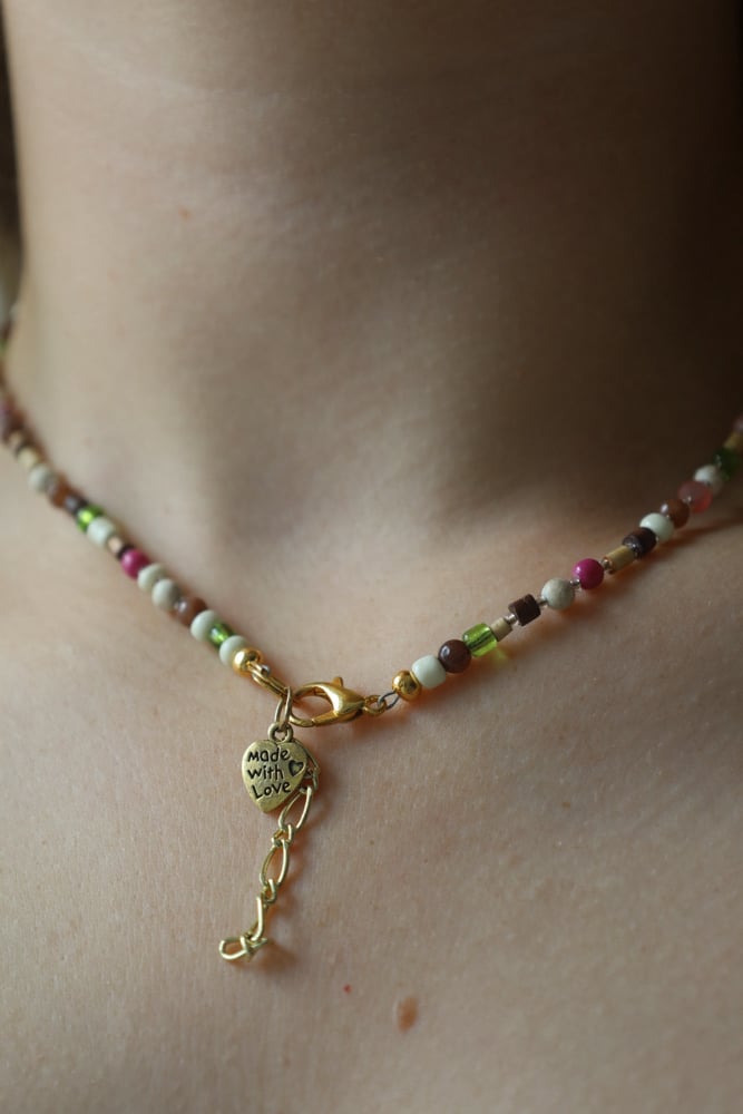 Beaded necklace featuring pink, green, and brown beads. Adjustable 8.6–9.5 inches. Finished with a lobster clasp. Hardware may tarnish with exposure to water.
