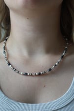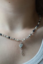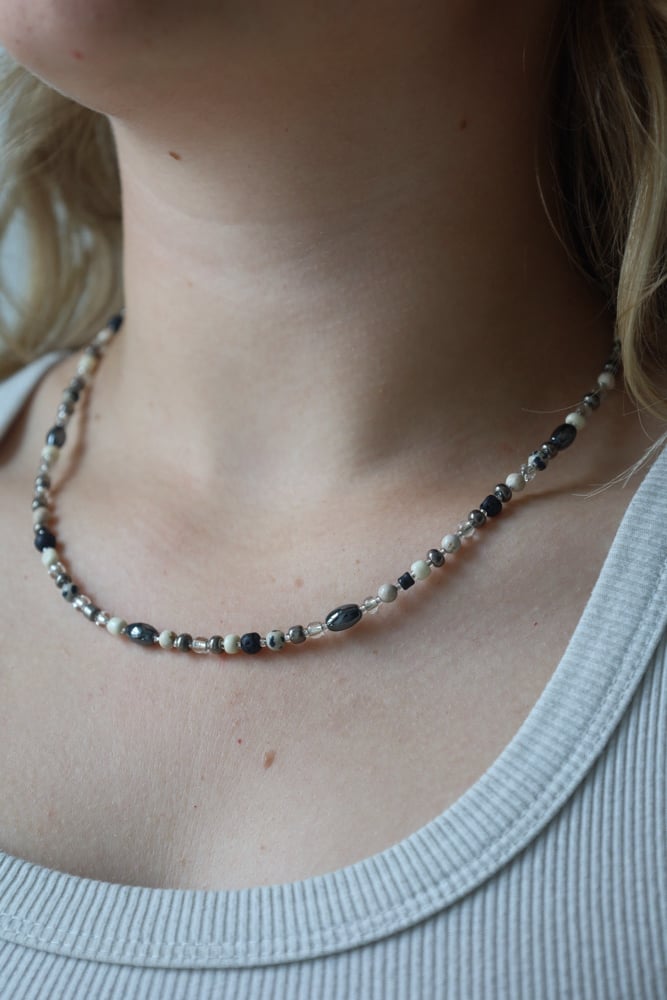 Beaded necklace featuring black and white beads, with small spacers. Adjustable 9.75–10.75 inches. Finished with a lobster clasp. Hardware may tarnish with exposure to water.