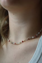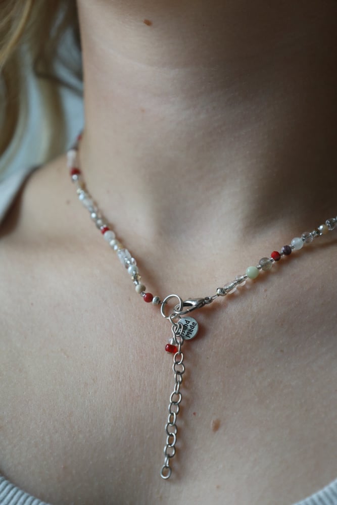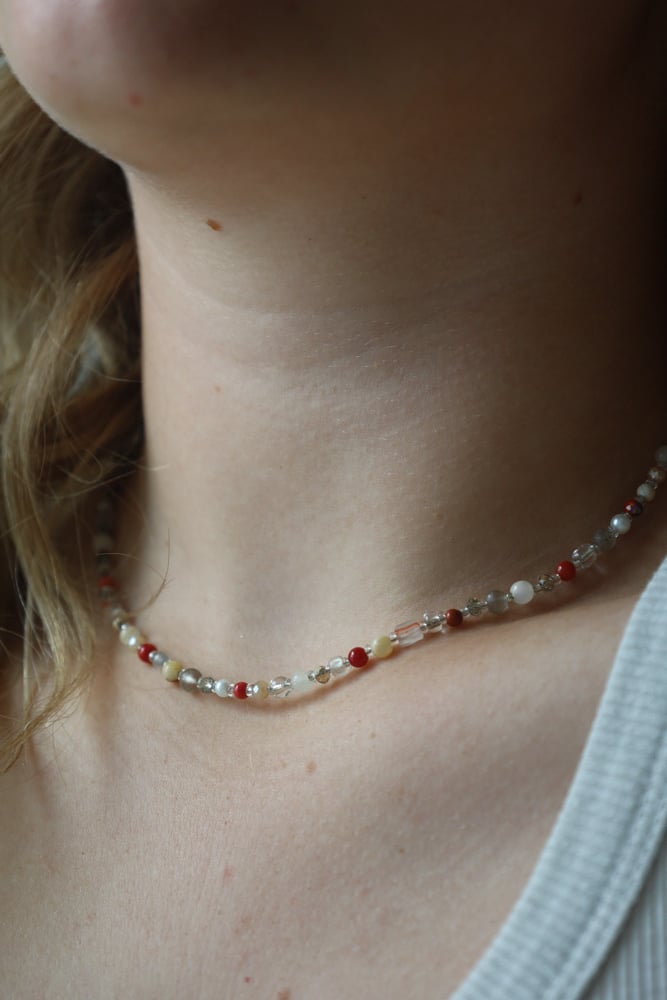 Beaded necklace featuring red, white, and clear beads. Adjustable 8.5–9.75 inches. Finished with a lobster clasp. Hardware may tarnish with exposure to water.