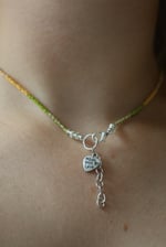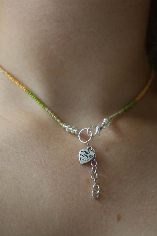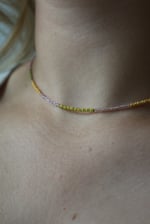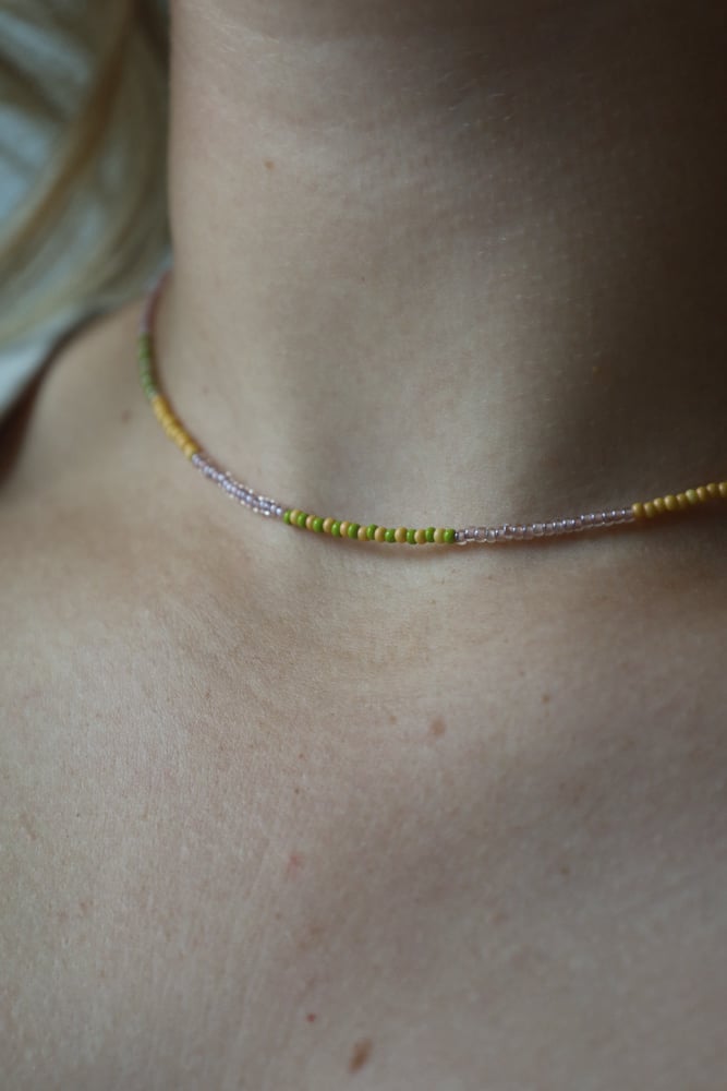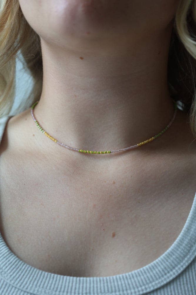 Seed bead necklace featuring yellow, green, and pink beads. Adjustable 8–8.75 inches. Finished with a lobster clasp. Hardware may tarnish with exposure to water.