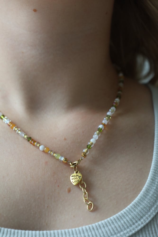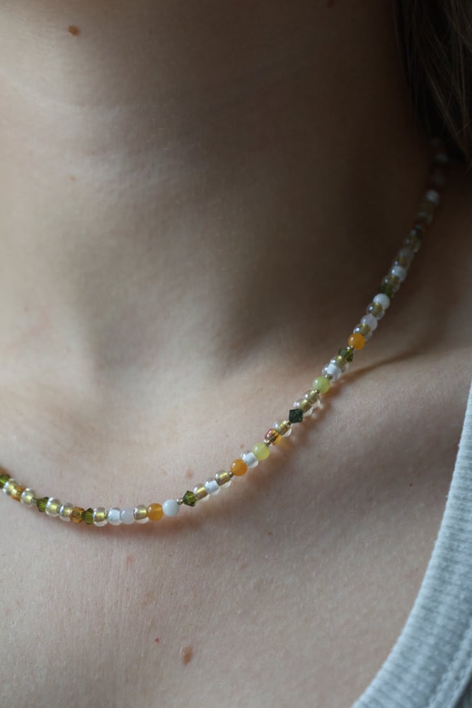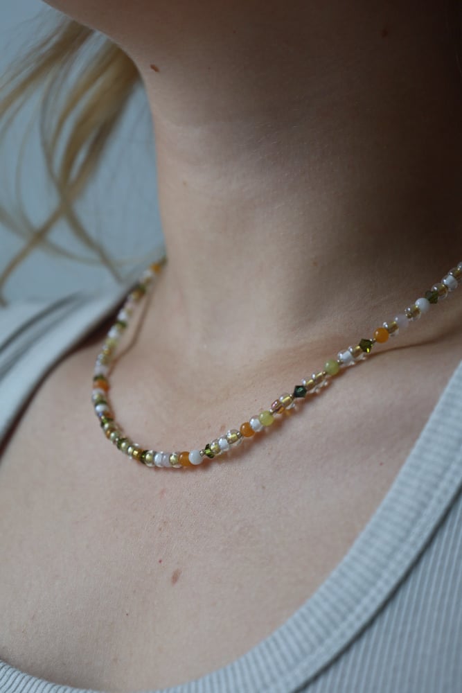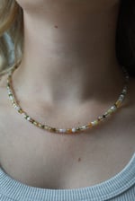 Beaded necklace featuring green and orange beads. Adjustable 9.5–10.25 inches. Finished with a lobster clasp. Hardware may tarnish with exposure to water.